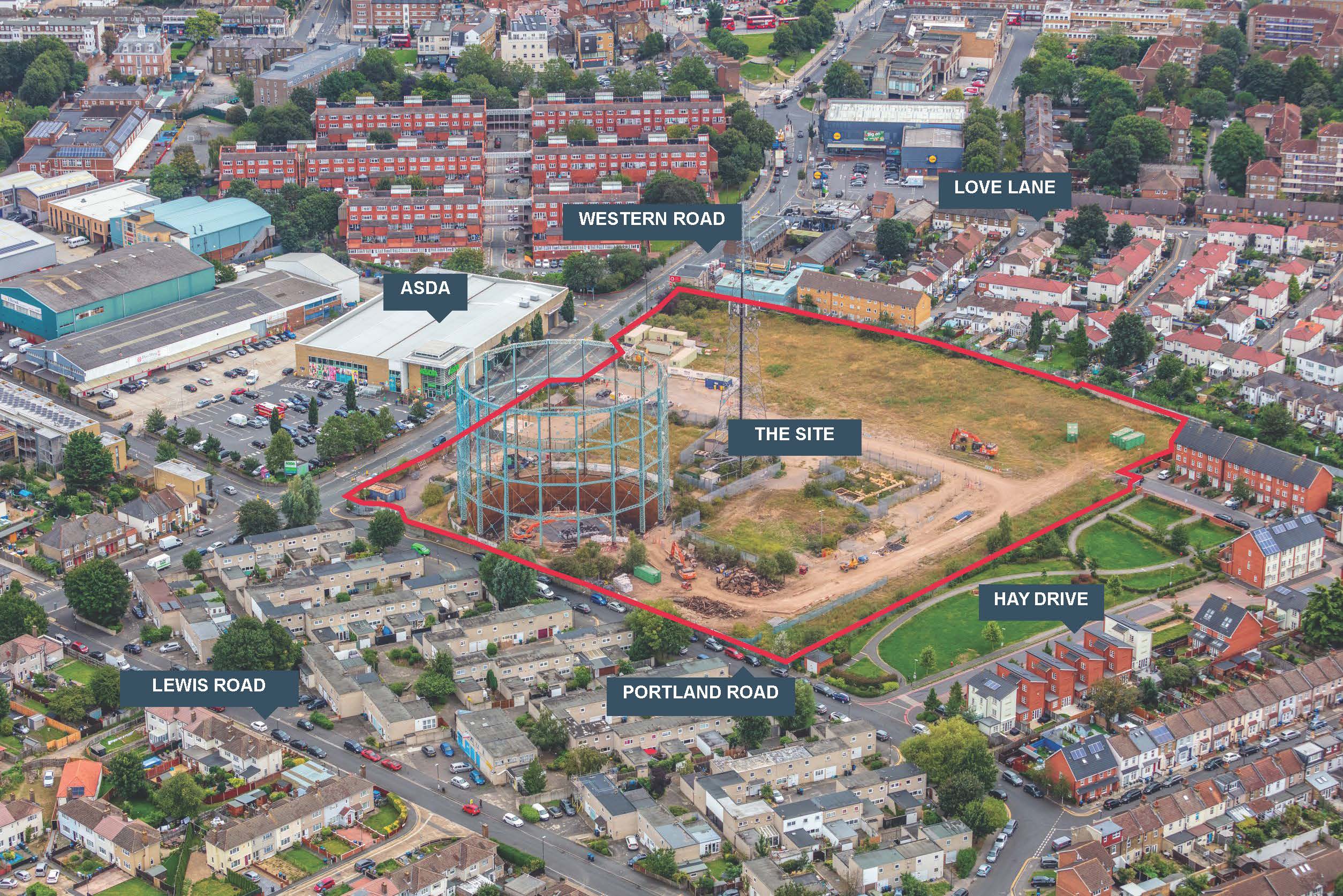 Located close to Mitcham Town Centre, the site is bound by Portland Road to the north, Western Road to the east, Field Gate Lane to the south and Hay Drive / Brickfield Road to the west. The houses located on Hay Drive and Brickfield were constructed on land that historically formed part of the wider gasworks site.